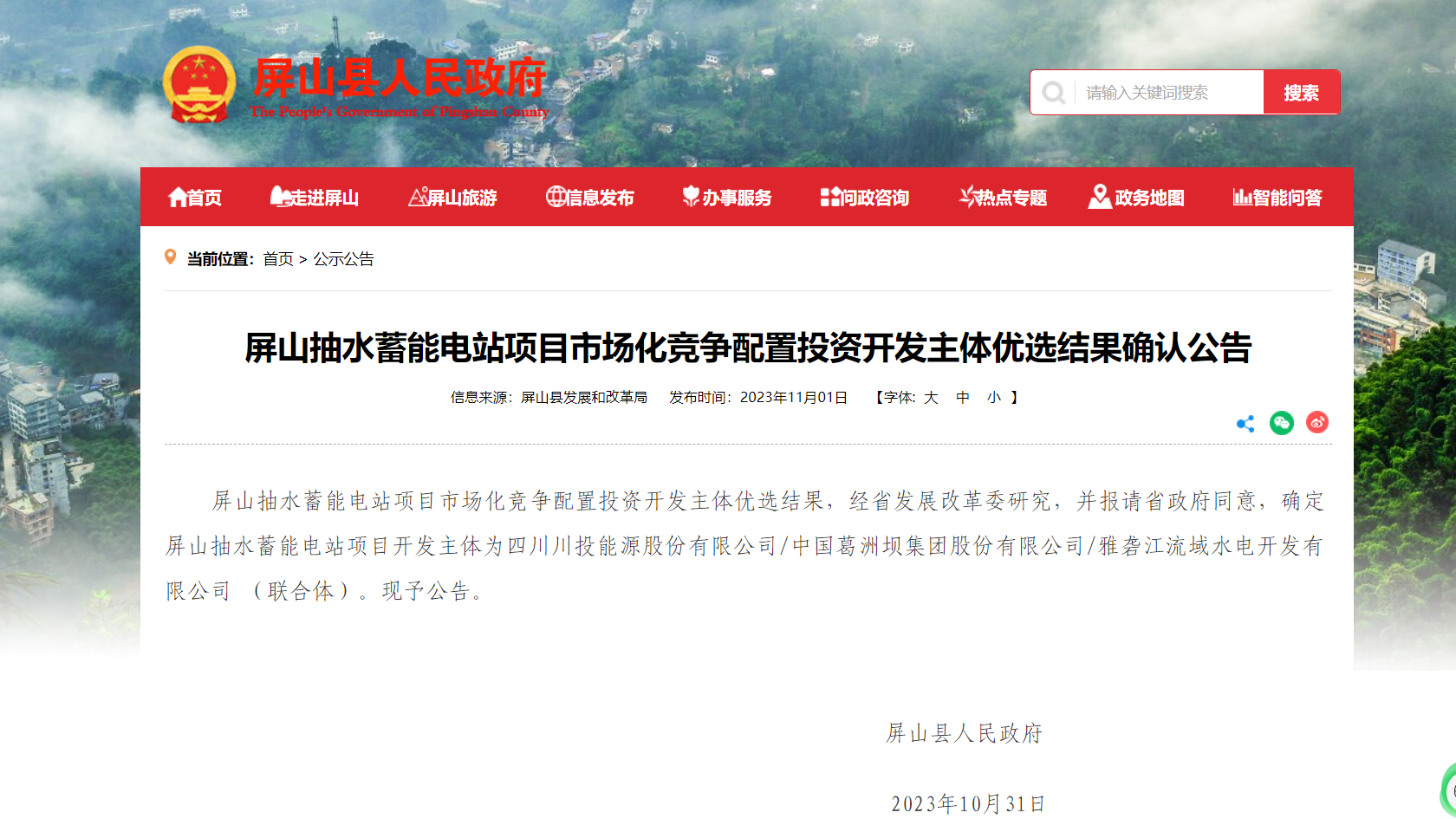 11月1日,宜宾市屏山县人民政府发布《屏山抽水蓄能电站项目市场化竞争配置投资开发主体优选结果确认公告》,足球彩票 、雅砻江流域水电开发有限公司、中国葛洲坝集团股份有限公司组成的联合体成功中标。该项目是足球彩票贯彻习近平总书记来川视察重要指示精神,以高质量主题教育成效推动企业高质量发展的新成果,是深入贯彻落实省委十二届三次全会精神,加力推进新型工业化的新体现,是推进“五区共兴”的新担当,是落实川投集团“1+3”产业发展战略的新作为,实现了在抽水蓄能领域、自主开发百万千瓦级电站领域“双破题”!
