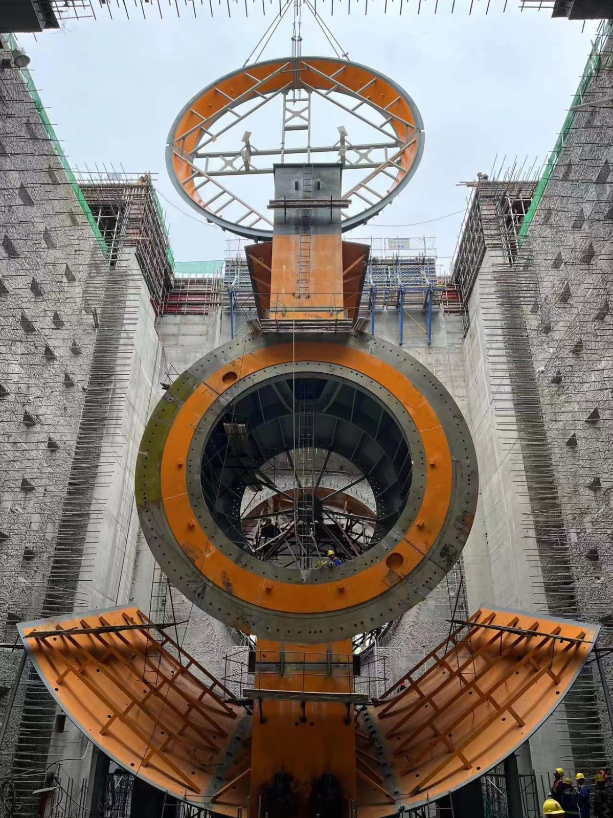 如同故宫有排水神兽螭首,银江也有独特的排水神器——尾水管。银江水电站尾水管出口直径12.05米,尾水管分3节,每节分4瓣,总重92.726吨,发电后每台尾水管排水流量可达577立方米每秒。尾水管安装是灯泡贯流式机组由土建施工向机电安装转序的标志,为加快工程推进,攀水电公司组织开展领导“分片包干”挂牌督导专项行动,开启“责任田”模式,自5月25日银江水电站首台机组尾水管安装按期交面开始,其余5台机组尾水管相继交面并安装完成,整体工期较原计划提前20天。