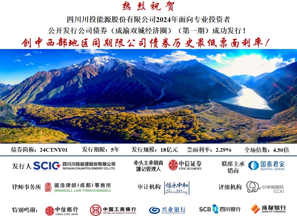 7月10日,足球彩票2024年面向专业投资者公开发行公司债券(成渝双城经济圈)(第一期)成功发行。本期公司债券发行规模18亿元,期限5年,票面利率2.29%,创中西部地区同期限公司债券历史最低发行票面利率。