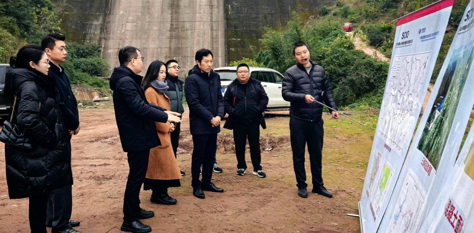 会前,戴月洪一行前往宜宾屏山书楼电站项目进行现场调研,在下水库坝址位置听取了项目总体布置情况汇报,在项目补水点和保宁村堆料场进行了现场踏勘,详细了解了项目现场工作开展情况。