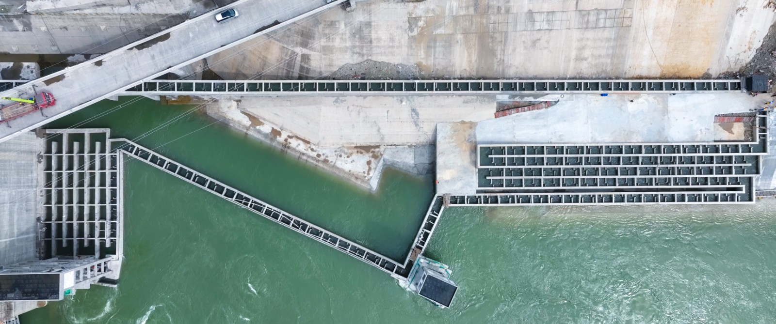鱼道全长约1003米,设有3个进口和1个出口,进口与出口之间最大落差为18米。施工设计方面,通过独特的隔板、侧室板等结构,减缓水流速度,形成一个个“缓流区”,如同为鱼儿们设置的“休息驿站”,让它们在洄游途中得以积蓄力量。为了吸引更多鱼类进入鱼道洄游,工作人员在3个进口处设置了补水系统,调整水流速度,诱导鱼类上溯洄游。此外,鱼道还配备了高科技监测设备,可实时掌握鱼类的动向,及时调整鱼道运行参数,确保鱼儿顺利通过。