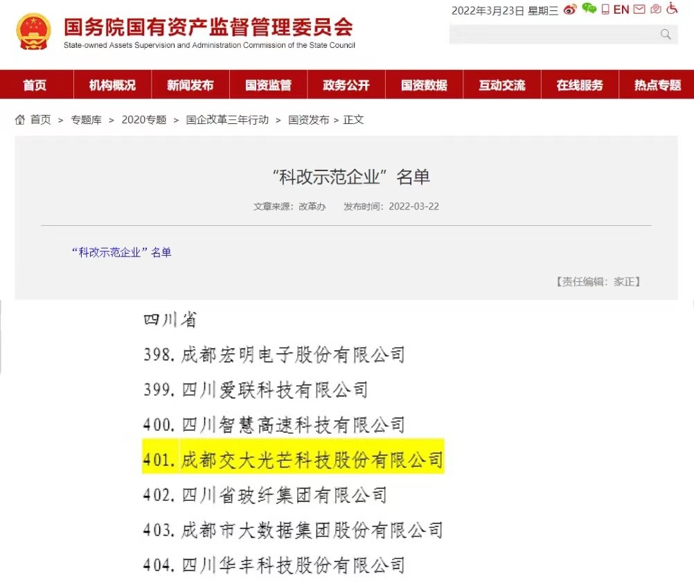 3月22日,国务院国资委网站公布《“科改示范企业”名单》,共440家企业纳入“科改示范行动”,交大光芒为四川省七家入选“科改示范企业”之一。
