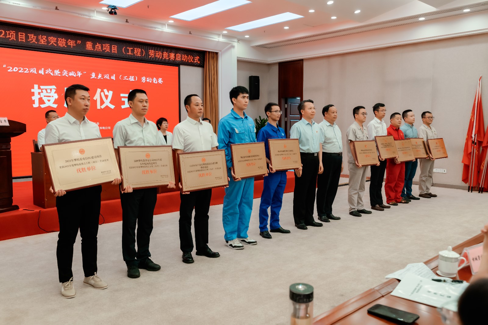 启动仪式上,市总工会授予金沙江银江水电站等项目(工程)为“2021年度攀枝花市重点项目(工程)劳动竞赛优胜单位”称号,并为金沙江银江水电站等“2022项目攻坚突破年”重点项目(工程)授旗,鼓舞大家加速建设、实现突破、取得实效。