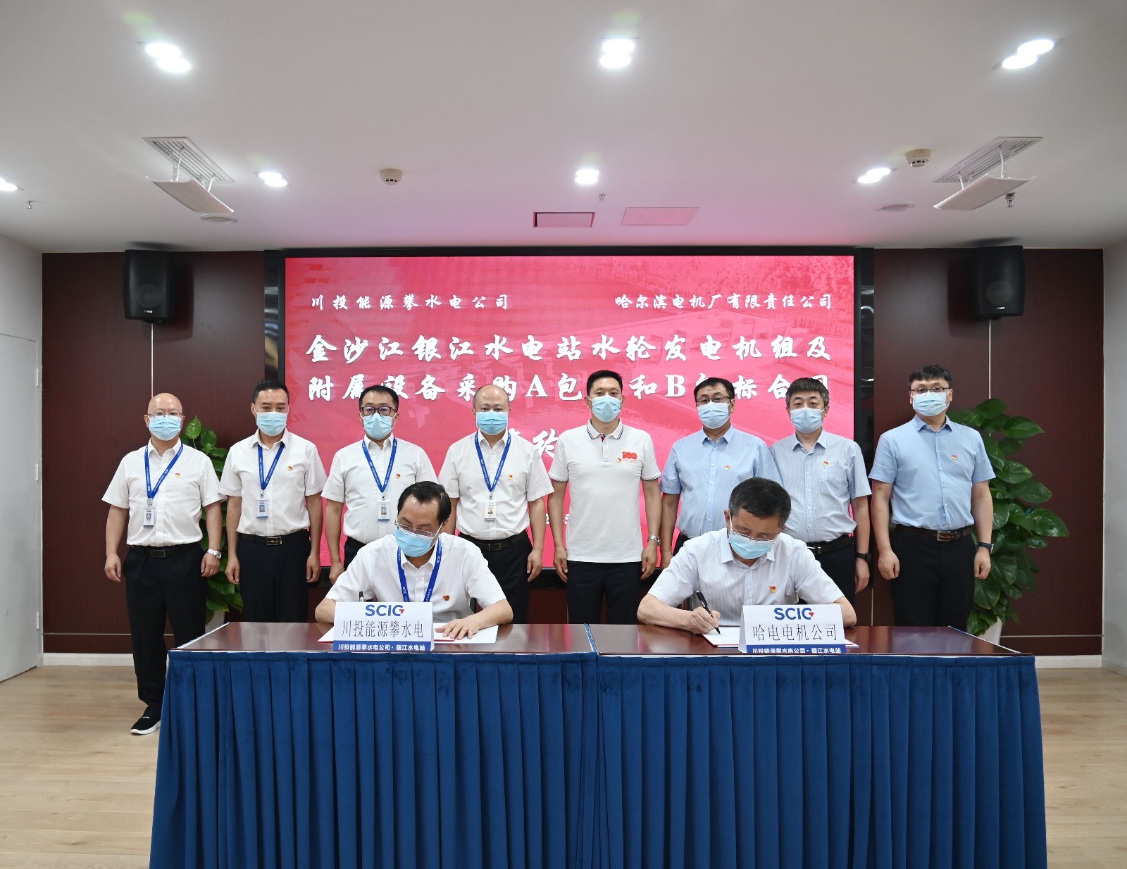 5月13日上午,攀水电公司在公司2620会议室举行了金沙江银江水电站水轮发电机组及附属设备采购A包标和B包标合同签约仪式。足球彩票 副书记、工会主席冉兰平出席仪式并见证签约,足球彩票副总经理、攀水电公司党总支书记、董事长、攀新能源公司董事长徐孝刚与哈尔滨电气股份有限公司副总裁、哈尔滨电机厂有限责任公司董事长、党委书记王贵代表双方签约,仪式由攀水电公司党总支委员、总经理吴巍屿主持,哈尔滨电机厂有限责任公司相关部门人员、攀水电公司与攀新能源公司领导及相关人员共23人出席仪式。