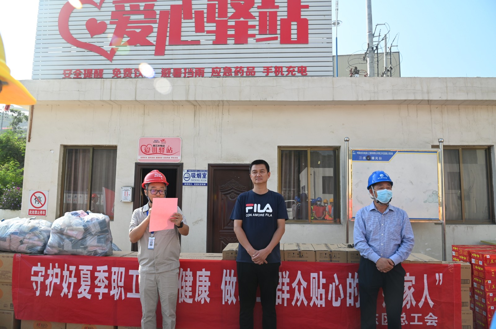 虽然是上午9点,但盛夏的烈日已炙烤着银江水电站工地。在银江水电站“爱心驿站”,汪庆元首先致敬全体工友烈日下的“银江精神”,高度赞扬了一线建设者三年来为银江水电站建设做出的积极贡献,并鼓励他们要战胜高温酷暑等重重难关,坚守岗位完成工程建设任务。刘欣在讲话中谈到:东区工会心系工友,是大家的“娘家人”,希望大家保重身体,平安度夏,在落实安全防护的前提下积极工作,保质保量推进项目施工,为攀枝花的经济建设做出更大的贡献。