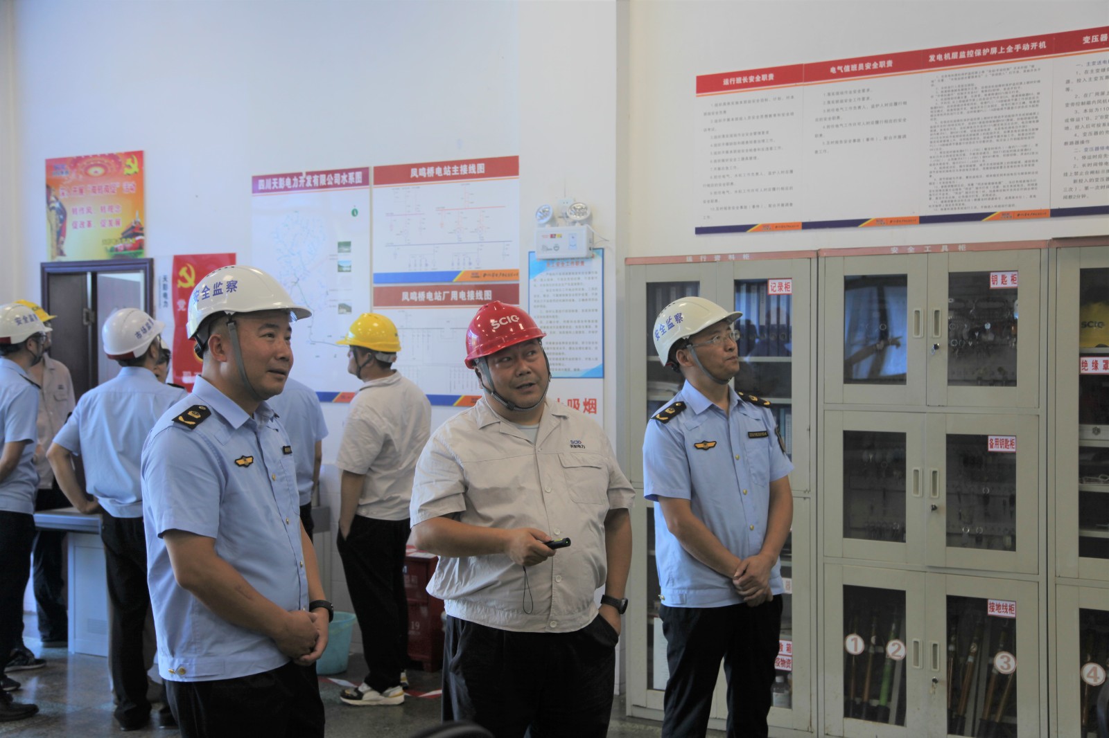 为全面贯彻落实上级关于安全生产的决策部署和工作要求,进一步强化各类特种设备安全管理和安全使用,确保企业安全生产、稳定运行,7月14日,彭州市市场监督管理局党组成员、副局长禹来,率特种设备安全监察科、知识产权监督管理科、通济市场监管所相关人员一行来到天彭电力,采取“四不两直”方式对公司特种设备、职工食堂安全管理等工作情况进行突击检查,天彭电力党总支书记、董事长、总经理陈忠陪同检查。