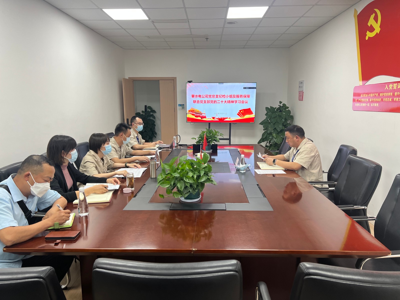 11月15日,攀水电公司党总支纪检小组长杨锐组织纪检小组成员及服务保障联合党支部党员,采取原文学习、重点解读、讨论交流等形式,对党的二十大报告、二十大关于《中国共产党章程(修正案)》的决议以及十九届中央纪律检查委员会向党的二十次全国代表大会的工作报告等重要文件进行了再学习、再部署、再深入、再落实。杨锐强调,纪检小组成员一是要率先垂范、先学先悟,不断提高政治判断力、政治领悟力、政治执行力;二是要提高站位、做实监督,把学习贯彻党的二十大精神作为当前政治监督的重中之重;三是要学以致用、解决问题,切实用党的二十大精神关于全面从严治党的新要求、新举措、新指示指导实践、推动工作;四是要立足岗位、坚定履职,持之以恒推进全面从严治党,不折不扣落实监督工作。