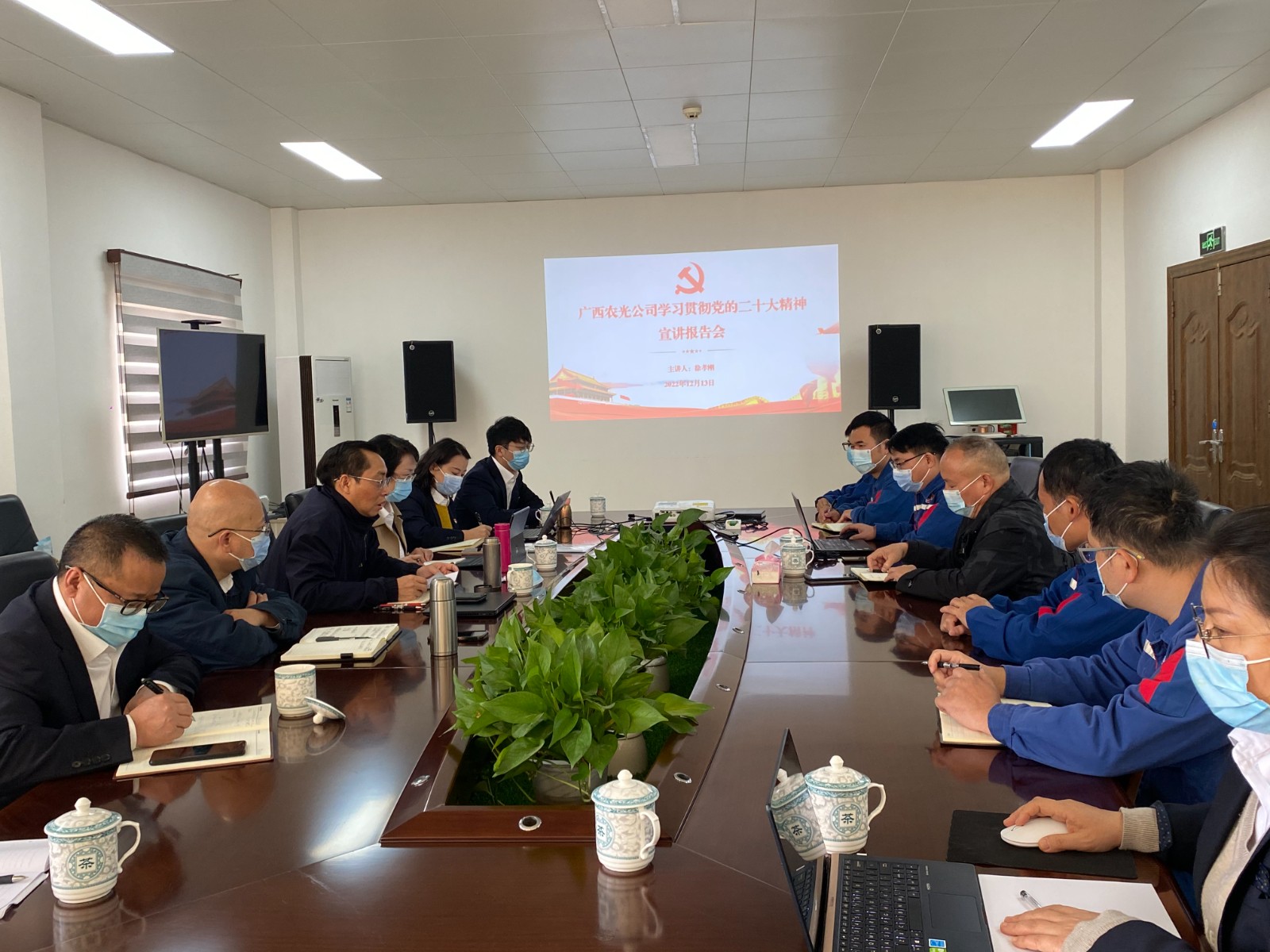 为进一步推动党的二十大精神走深走实,12月14日上午,足球彩票副总经理,攀水电党总支书记、董事长,攀新能源董事长,广西农光董事长徐孝刚一行赴广西农光公司作党的二十大精神专题宣讲。攀水电党总支学习贯彻党的二十大精神宣讲组成员、广西农光公司全体党员、干部职工共20人参加宣讲会,会议由攀新能源公司副总经理杨岚主持。
