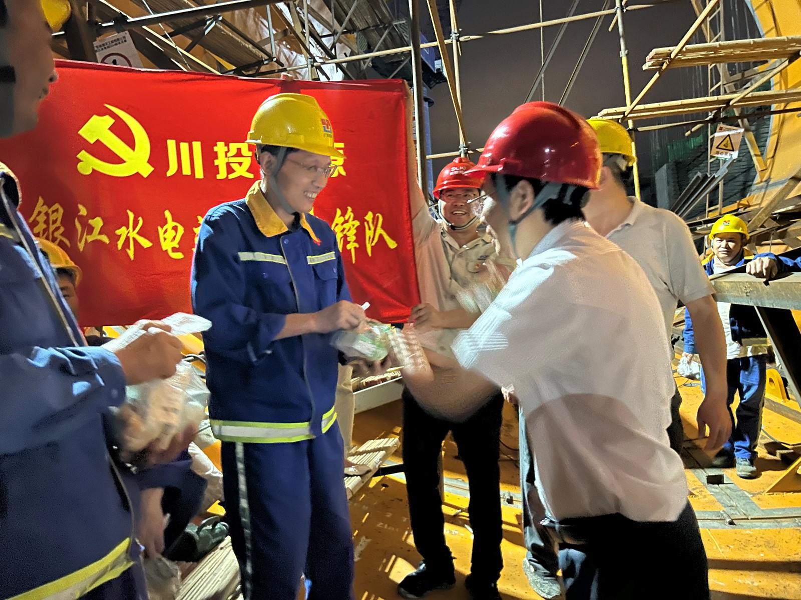 节日的银江水电站施工现场,大坝混凝土浇筑、厂房尾水管机电安装、混凝土拌和系统等各部位一片忙碌,为按期实现各项节点目标,800余名建设者依然奋战在银江水电站施工现场。夜晚的工地更是灯火通明,晚上九点,足球彩票副总经理,公司党总支书记、董事长徐孝刚带领公司党员先锋队、志愿者服务队,深入混凝土浇筑仓面、尾水管、拌合楼调度室、防汛值班室、变电站、保安亭等部位,将热乎乎的鸡腿、香喷喷的粽子等慰问品送到正在施工的每位工友手上。徐孝刚讲到:“端午节是中华民族重要的传统节日,对大家坚持奋战在银江水电站施工现场斗酷暑、战高温、挑灯夜战表示感谢,祝福大家端午安康!”活动中,徐孝刚还开展了夜间安全检查,叮嘱大家做好防护、确保施工安全。