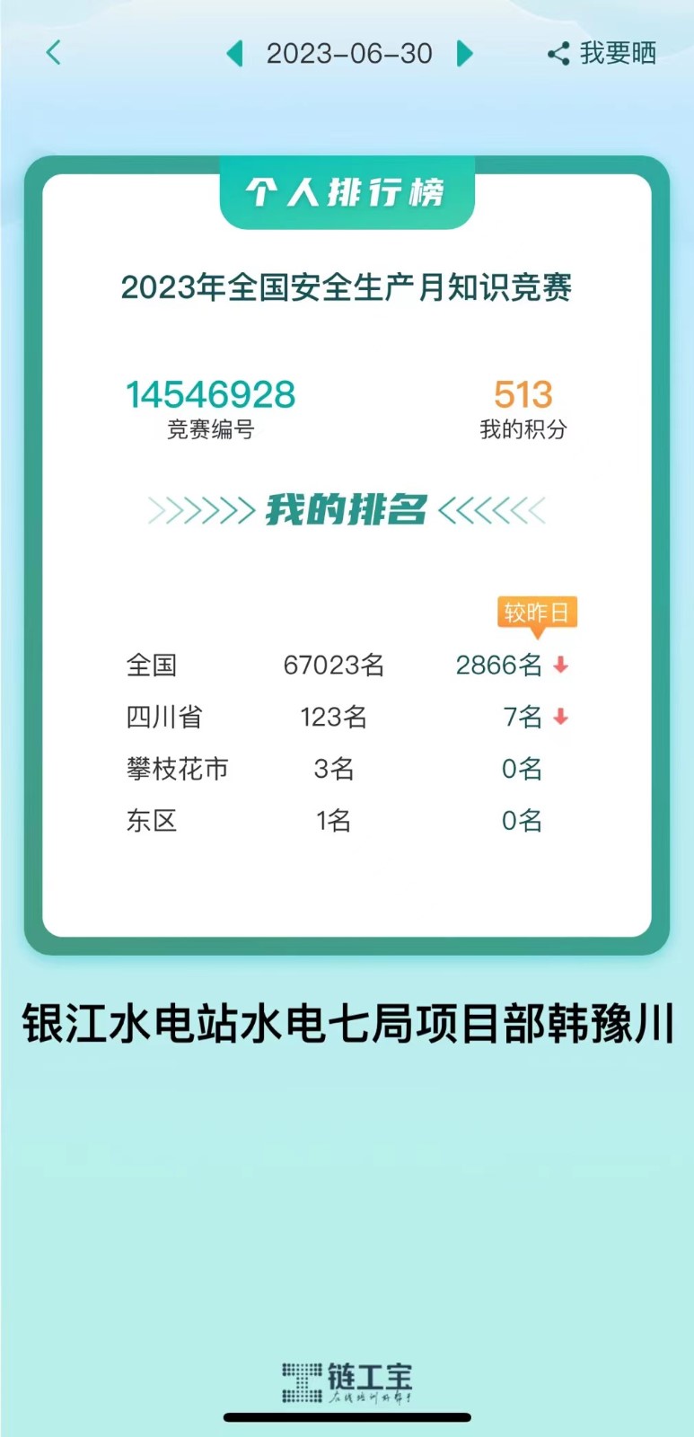 在“链工宝”2023年全国安全生产月知识竞赛活动中,攀枝花市前10名中,银江水电站占3人,东区前10名中,银江水电站占6人,有效检验了安全生产月活动成果,充分体现了银江水电站学安全、讲安全的浓厚安全生产氛围,进一步强化了广大工程参建人员的安全生产意识。