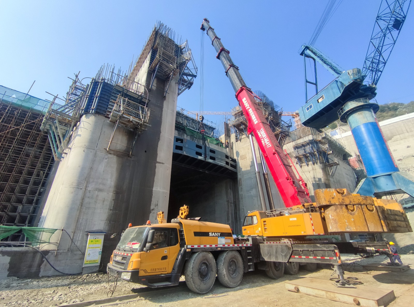 银江水电站6台机组尾水出口各设有1道事故检修闸门,闸门孔口尺寸16m×14.01m,为平面定轮闸门,单扇闸门重量323t。闸门结构尺寸大,单节重量重,吊装难度大,加之混凝土浇筑工期异常紧张,如采用原设计方案利用坝顶固定卷扬机进行吊装,2024年第四季度下闸蓄水目标将无法完成。为此,公司多次组织会议商讨技术方案,结合土建施工计划,待尾水闸墩浇筑过门楣高程后,利用450t汽车吊将闸门先行吊入门槽立拼安装,后期采取临时措施再吊起闸门安装水封,上述措施有效解决了闸门安装工期严重不足的问题。