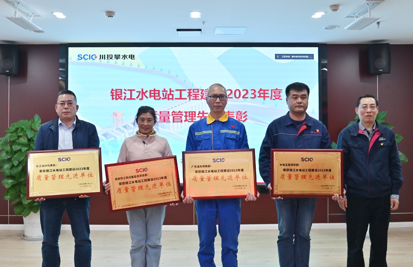 会上,公司副总经理唐伽宣读了《关于表彰银江水电站2023年度质量管理先进单位、先进集体和先进个人的通报》文件,徐孝刚向荣获2023年度质量管理先进单位的长江设计代表处、西安热工院设备监造项目部、水电五局项目部、广东源天项目部颁发了奖牌;公司党总支副书记、董事会秘书、工会主席邓勇,公司党总支委员、纪检小组长杨锐向荣获先进集体的长江设计代表处坝工专业组、贵阳院监理部土建工程管理部、西安热工院设备监造项目部驻哈电监造站、水电七局项目部砂石工区、水电五局项目部土建三队、广东源天项目部主机班等13个集体颁发了奖牌。徐孝刚向获奖的单位、集体及个人表示了祝贺,要求他们在今后的质量管理工作中发挥好先锋模范带头作用,促进各参建单位共同提高质量管理水平,把银江水电站建设成“精品工程、样板工程、阳光工程”。