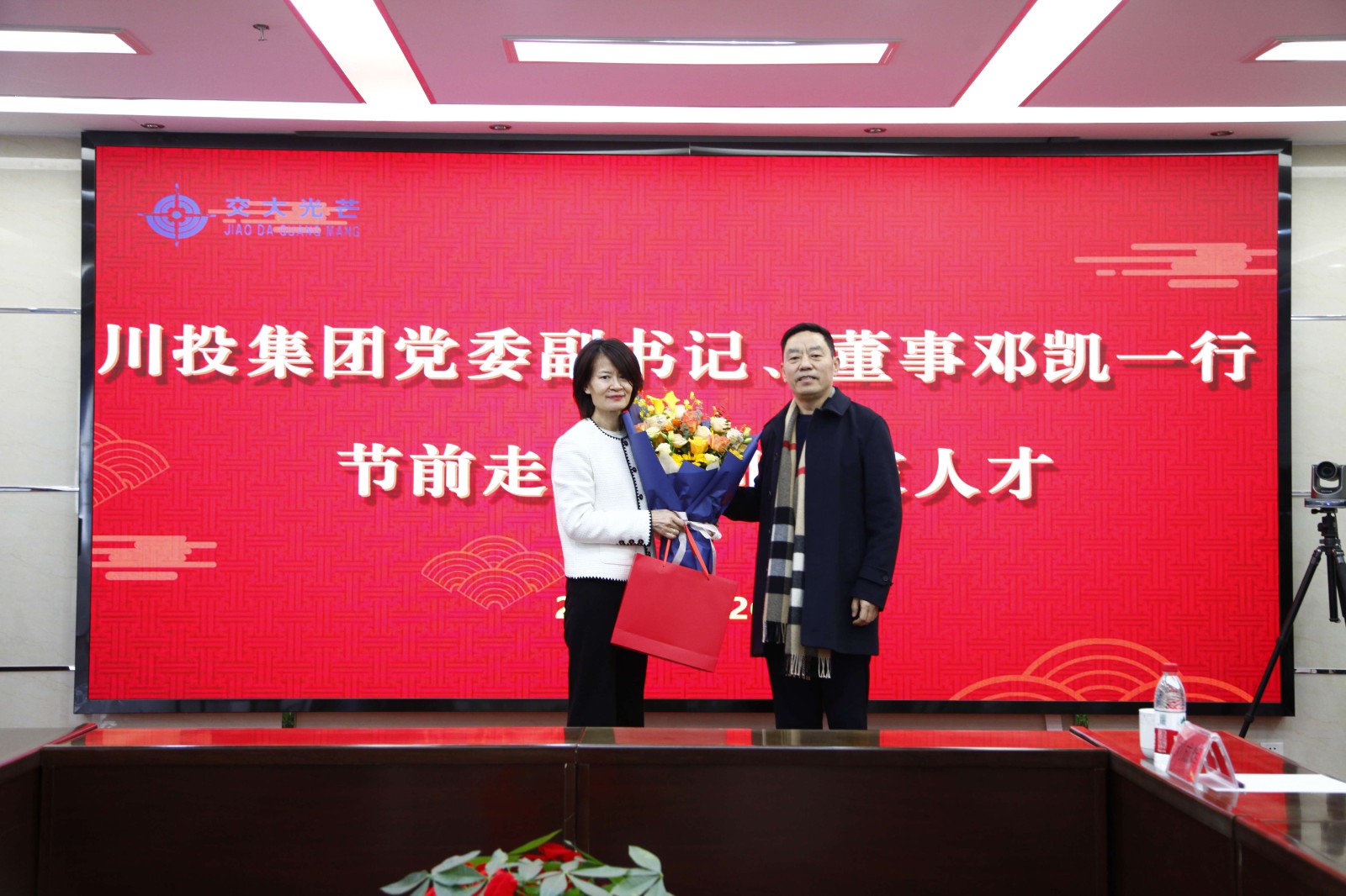 1月26日,川投集团党委副书记、董事邓凯带队赴交大光芒走访慰问专家人才。川投集团机关党委书记、党委组织部部长朱莉,党委宣传部(群团工作部)部长何金辉参加走访慰问。足球彩票 委员、财务总监兼交大光芒董事长刘好一同参加走访慰问。