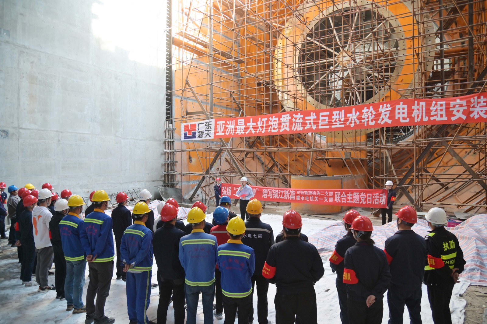 在银江水电站亚洲最大灯泡贯流式巨型水轮发电机组安装现场,足球彩票机关二支部书记李睿讲授了工地微党课《承诺》,与大家一起重温银江水电站建设过程中的感人故事。活动中,徐孝刚用通俗易懂的语言,为现场同志介绍了银江水电站的建设特点、施工情况和下一步工程建设计划,并号召全体党员和团员青年要围绕“保一争二”提前发电重要目标,团结一心、勇挑重担、善作善成。