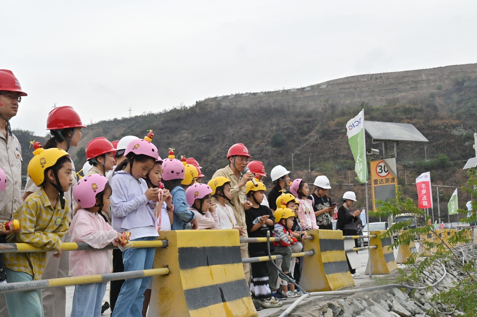 徐孝刚书记带领小朋友们在观景平台俯瞰银江工地,不时俯下身子,以简单有趣、深入浅出的语言,让小朋友们领悟了工程的艰辛历程和电能的来之不易,提醒大家要培养节约用电的意识。最后,孩子们来到上游围堰,近距离参观了建设中的银江水电站大坝。孩子们被壮观的“钢筋混凝土巨人”深深震撼,现场不时爆发出孩子们的掌声和欢呼声,为平时繁忙的银江工地平添了一份生机和活力。