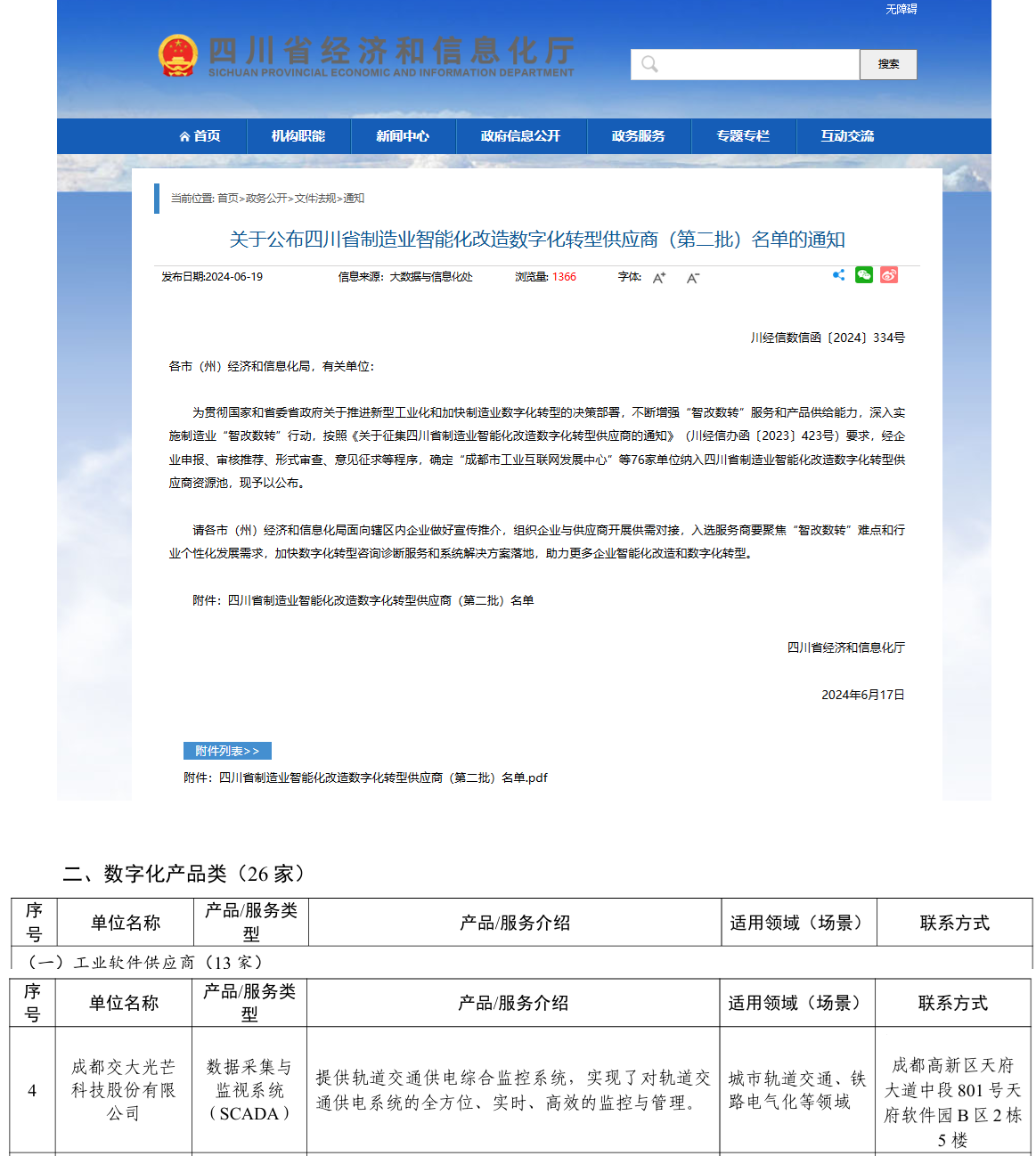 2024年6月19日,四川省经济和信息化厅网站公布四川省制造业智能化改造数字化转型供应商(第二批)名单,交大光芒作为数字化产品类工业软件供应商入选四川省制造业智能化改造数字化转型供应商资源池。