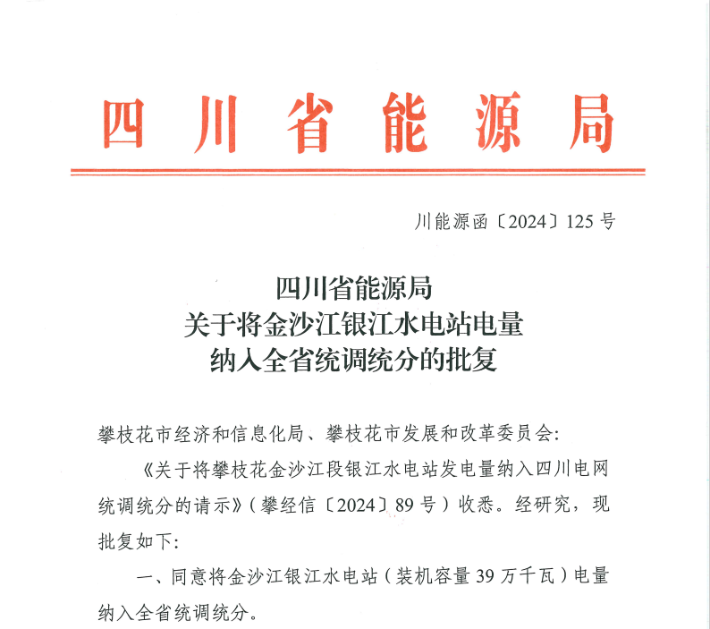 8月27日,在四川省能源局、攀枝花市有关部门和足球彩票的指导帮助下,经过积极对接、多方协调,攀水电公司成功取得四川省能源局将银江水电站电量纳入全省统调统分的批复,为实现银江水电站2024年首台机组投产发电目标再增“助推器”。