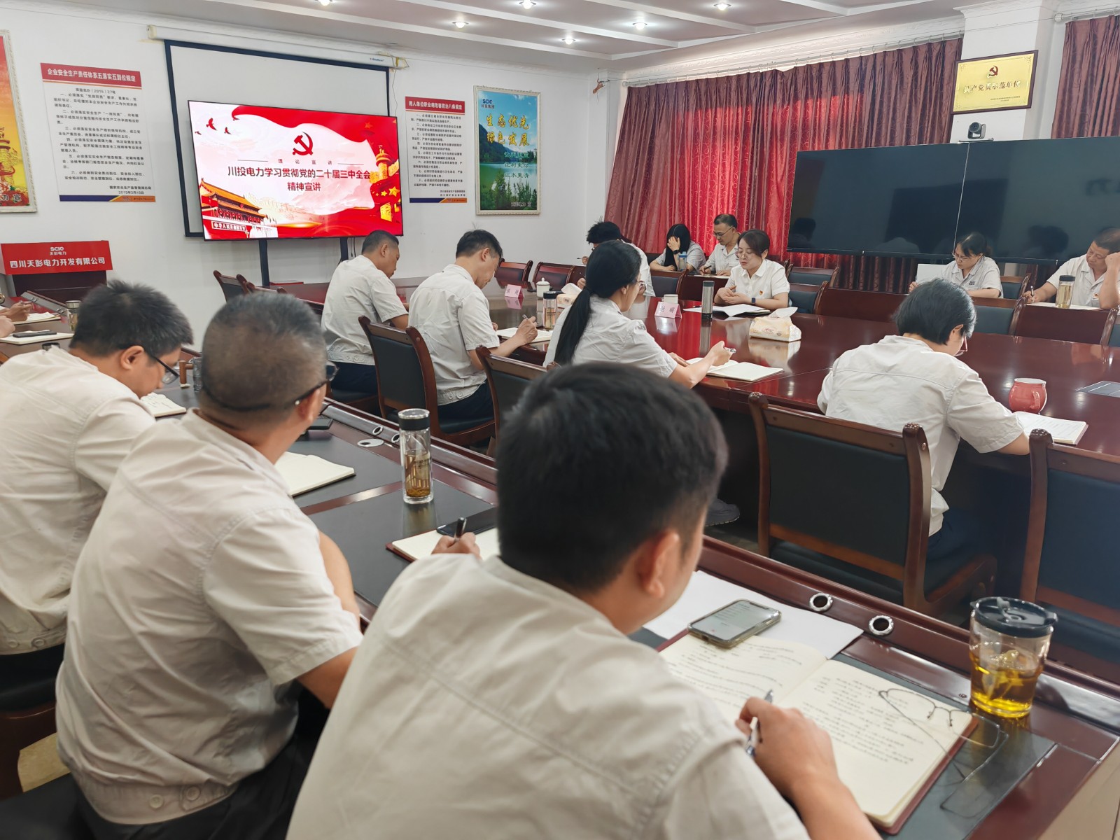近日,川投电力党委委员、纪委书记谢丽到天彭电力宣讲党的二十届三中全会精神,引导广大党员干部进一步把思想和行动统一到党中央决策部署上来,激发干事创业活力。天彭电力领导班子成员、党员、干部、关键岗位人员参加宣讲会。