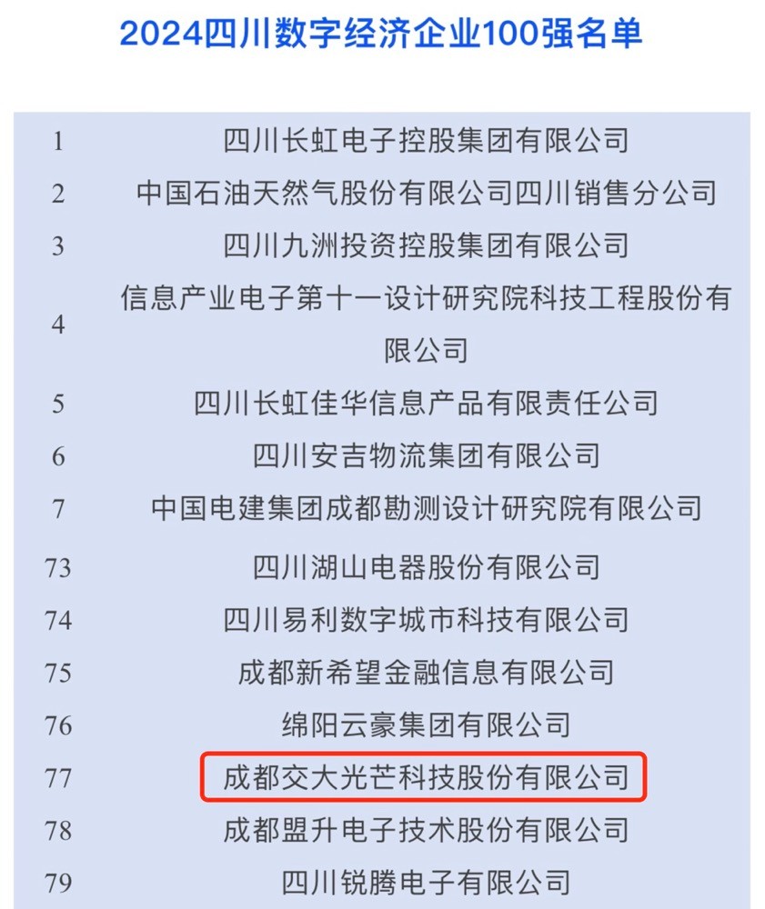 9月26日,四川大企业大集团发展大会在成都召开,会上,四川省企业联合会发布了2024年四川企业100强、制造业100强、服务业100强和数字经济100强榜单,交大光芒荣登四川数字经济企业100强榜单,位列第77位。