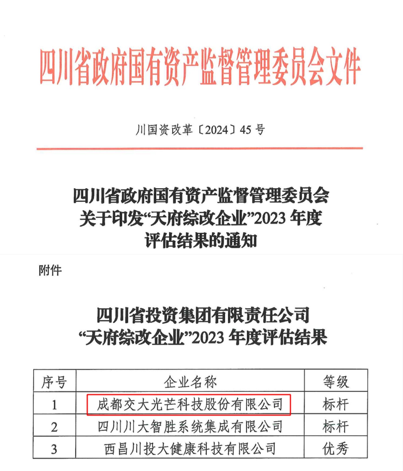 近日,四川省国资委印发“天府综改企业”2023年度评估结果,交大光芒被评为A级(标杆)。此次评估由省国资委聘请独立第三方机构进行,97户“天府综改企业”中被评为A级(标杆)的共22户。