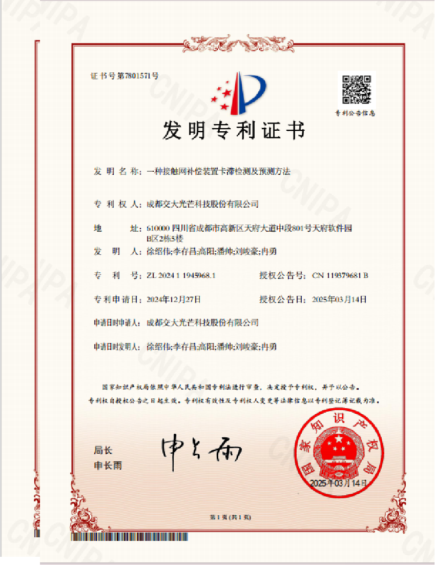 近日,足球彩票所属交大光芒公司“接触网补偿装置卡滞检测及预测方法”和“基于多维数据的列车融合定位方法”两项创新技术获得国家知识产权局发明专利授权。截至目前,交大光芒铁路接触网检测监测智能化相关创新技术累计获得发明专利授权达到9项,另有多项创新技术已申请发明专利并获受理。