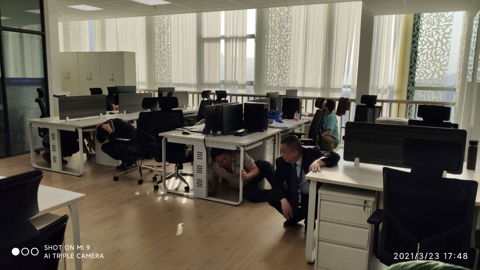 同日下午,攀水电公司在钢城经贸大厦A座办公楼(26楼)会议室进行了地震灾害疏散演练培训。演练开始前,组织观看了地震灾害应急知识短视频,并介绍讲解了办公楼紧急疏散通道和疏散路线,强调了避震原则以及紧急避震、紧急疏散、紧急抢救相关知识与注意事项。17点45分05秒,模拟演练发生4.8级地震,震源深度为12公里,震感强烈,各参演人员按照紧急避震原则,采取低头、蜷曲身体、爬入办公桌下等有利于避震的方式防护身体重要部位。主震结束后,公司第一时间启动应急响应,立即组织各参演人员按照既定的疏散路线安全撤离到达指定区域。