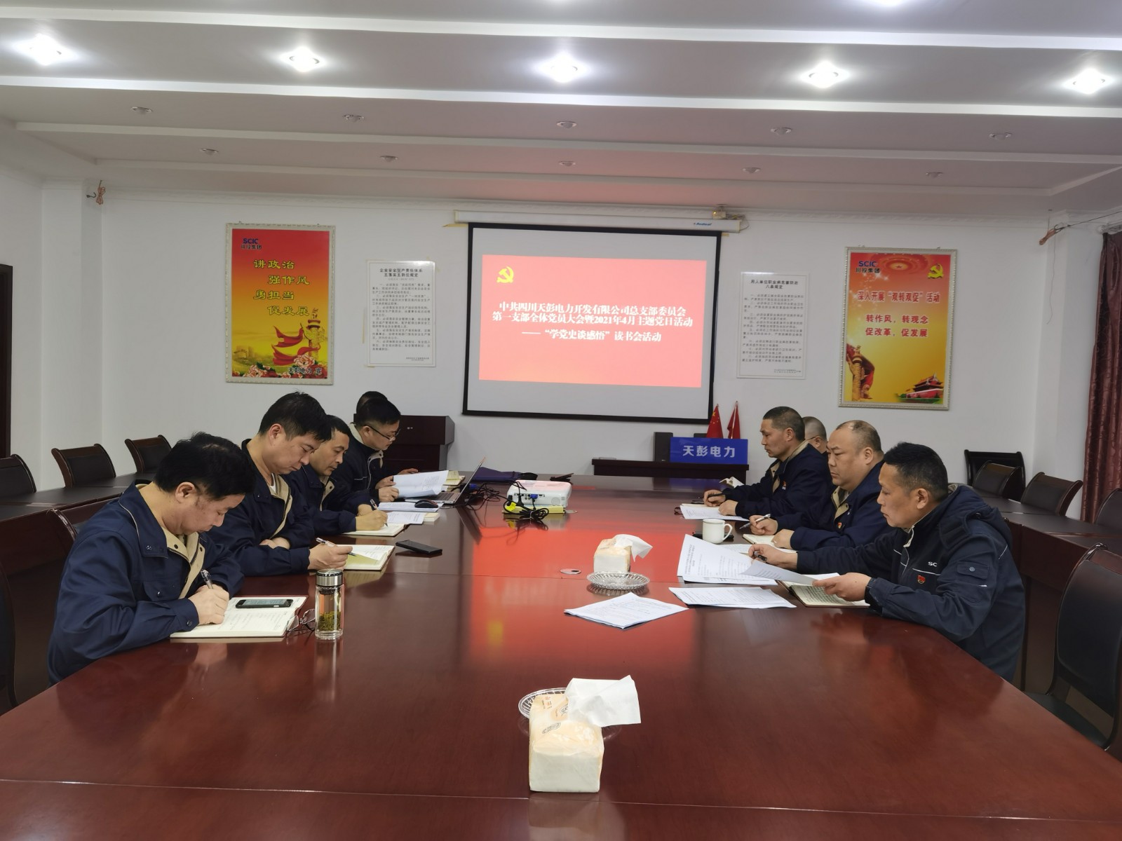 按照公司党总支关于党史学习教育的安排,4月27日下午,足球彩票天彭电力第一党支部全体党员在二楼会议室开展了“学党史 谈感悟”党史学习教育读书会主题党日活动, 公司党总支书记、总经理陈忠参加了活动,活动由第一党支部书记何刚主持。