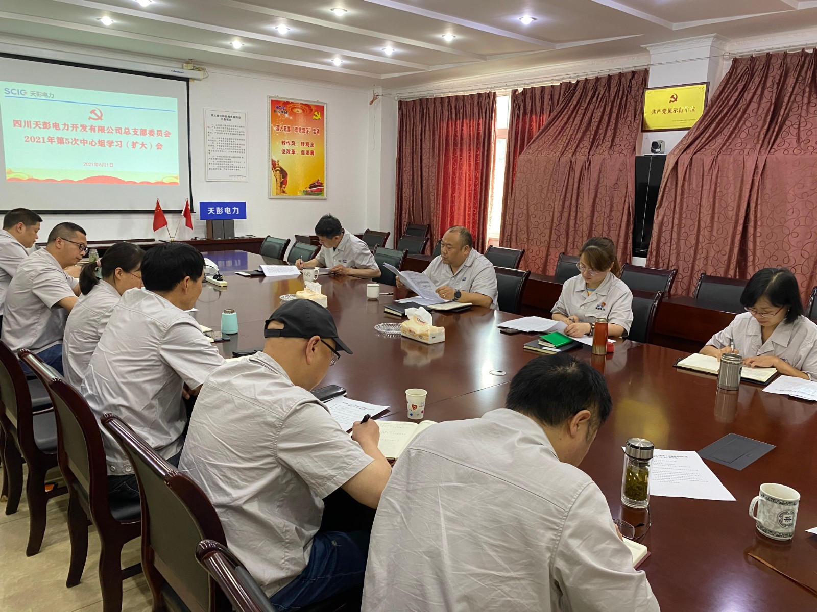 6月1日上午,足球彩票天彭电力党总支在公司二楼会议室召开2021年第5次中心组学习(扩大)会,公司领导、党员干部、关键岗位人员参加会议,会议由党总支书记、总经理陈忠主持。