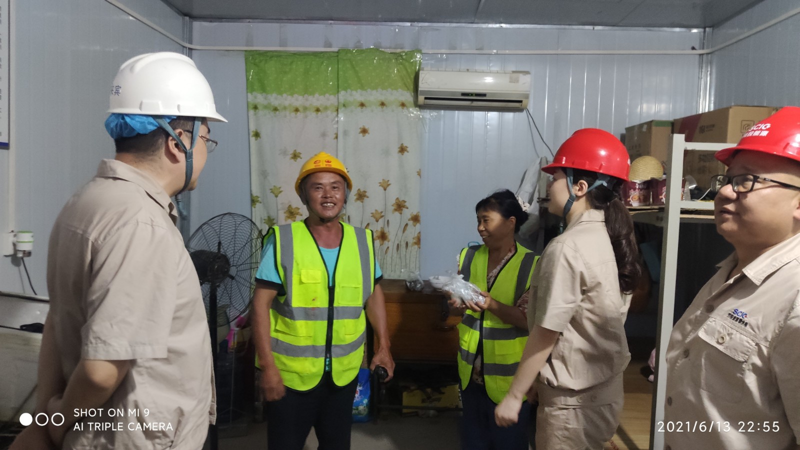 6月13日端午节前夕深夜,公司值班领导、党总支委员、董事会秘书、工会主席邓勇,总经理助理唐伽带领值班人员,对银江水电站工地现场防洪度汛值班点位及施工现场进行了检查;公司志愿者服务队共计10余人对节日期间坚守在银江水电站工地夜间施工的一线人员进行了慰问。