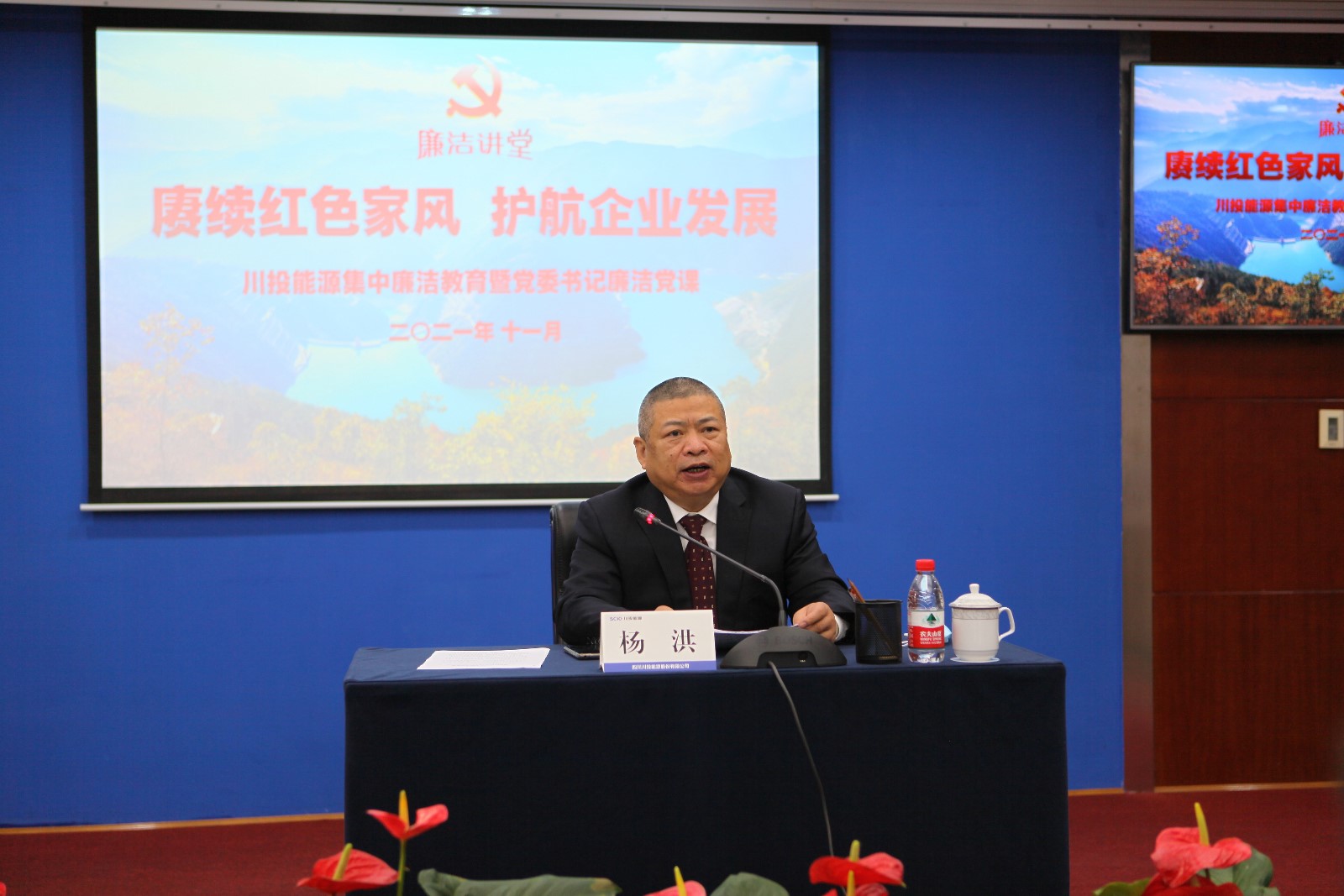 为贯彻落实中央关于全面从严治党部署和要求,切实推进公司党风廉政建设,推动“好风传家”工作落实落细,2021年11月25日上午, 足球彩票 组织召开了2021年集中廉洁教育会,公司党委书记、副董事长、总经理杨洪以“赓续红色家风,护航企业发展”为题给公司党员干部讲授廉洁党课,并组织观看了由中央纪委国家监委宣传部、中央广播电视总台联合制作的电视专题片《正风反腐就在身边》之《严正家风》。公司党委副书记、工会主席冉兰平主持会议。