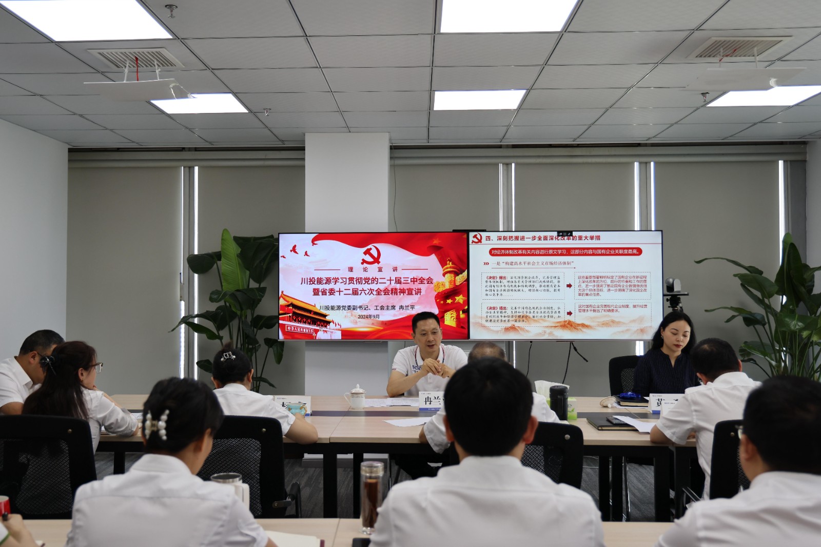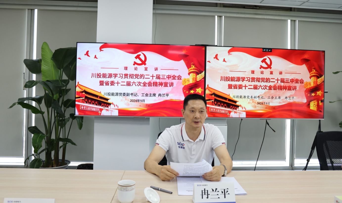 9月26日,足球彩票 副书记、工会主席冉兰平赴川投电力公司专题宣讲党的二十届三中全会精神和省委十二届六次全会精神,为进一步全面深化改革凝心聚力。川投电力党委副书记、总经理蔡承德主持会议。